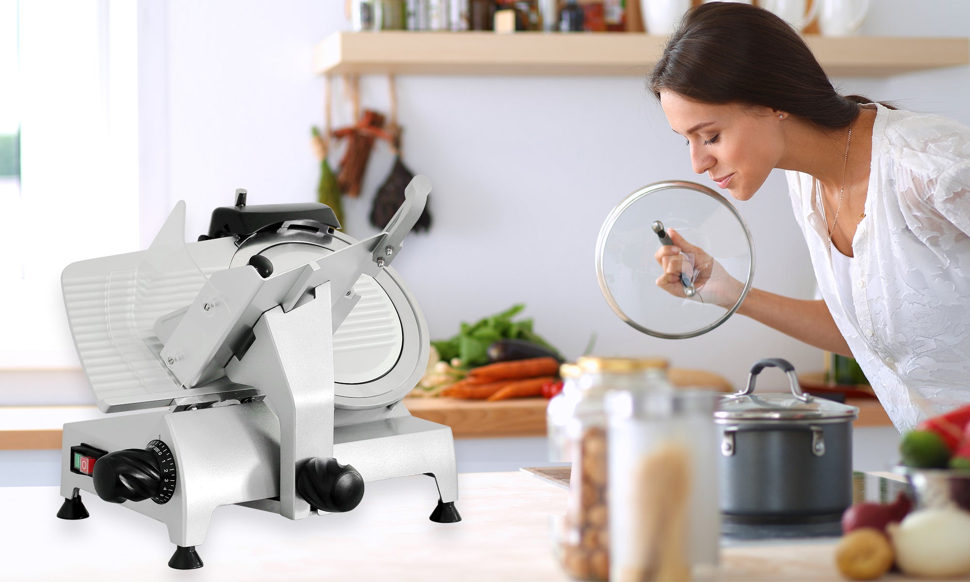 Durable 12’’ slicer with adjustable thickness, powerful motor, and compact design for precise, safe cuts.
