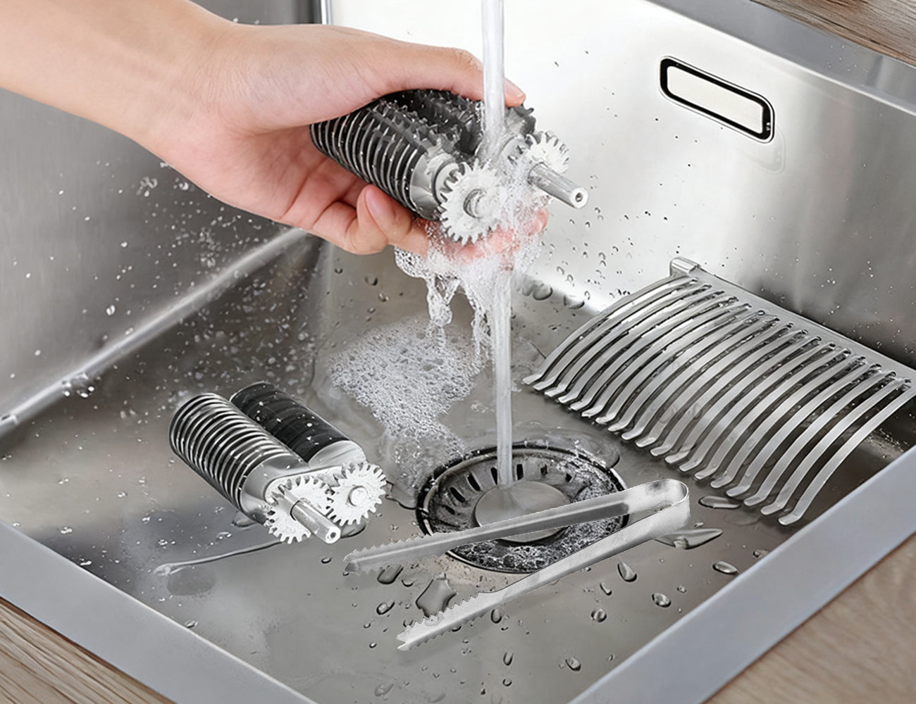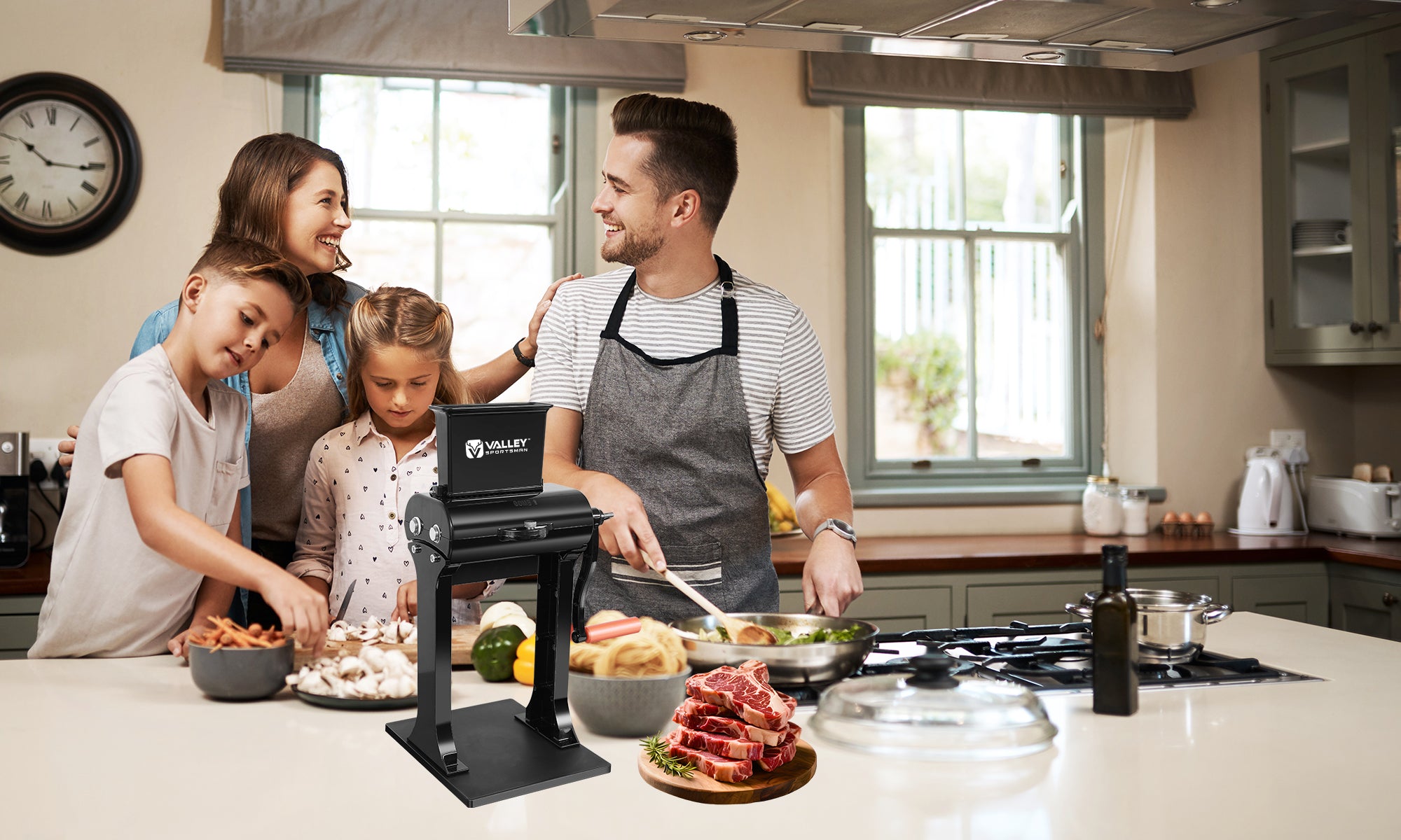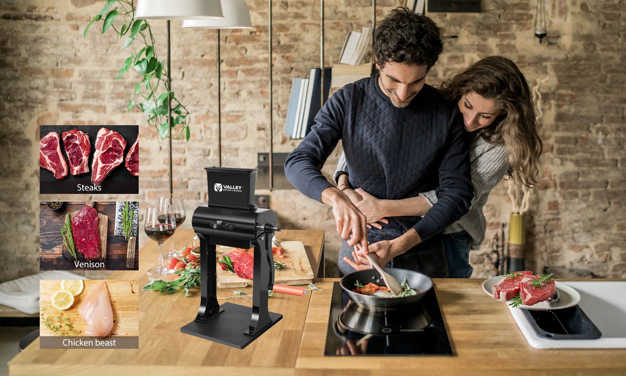Compact 2-in-1 stainless-steel meat tenderizer and slicer with dual blades, universal meat compatibility, and easy countertop cleanup for fast, flavorful cooking.