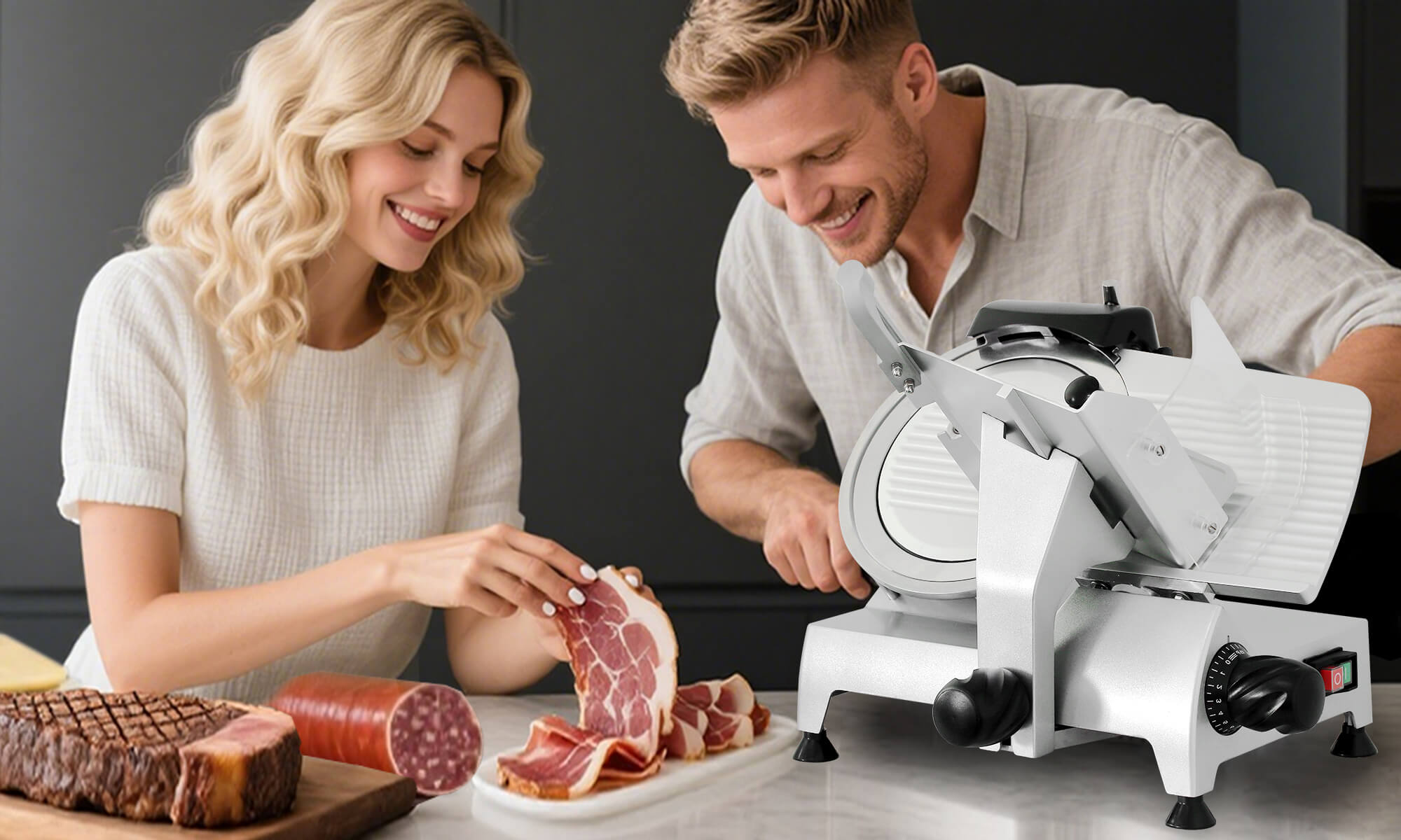 ETL-certified 8” meat slicer with sharp blade, adjustable thickness, quiet motor—built tough for reliable slicing at home or in commercial kitchens.